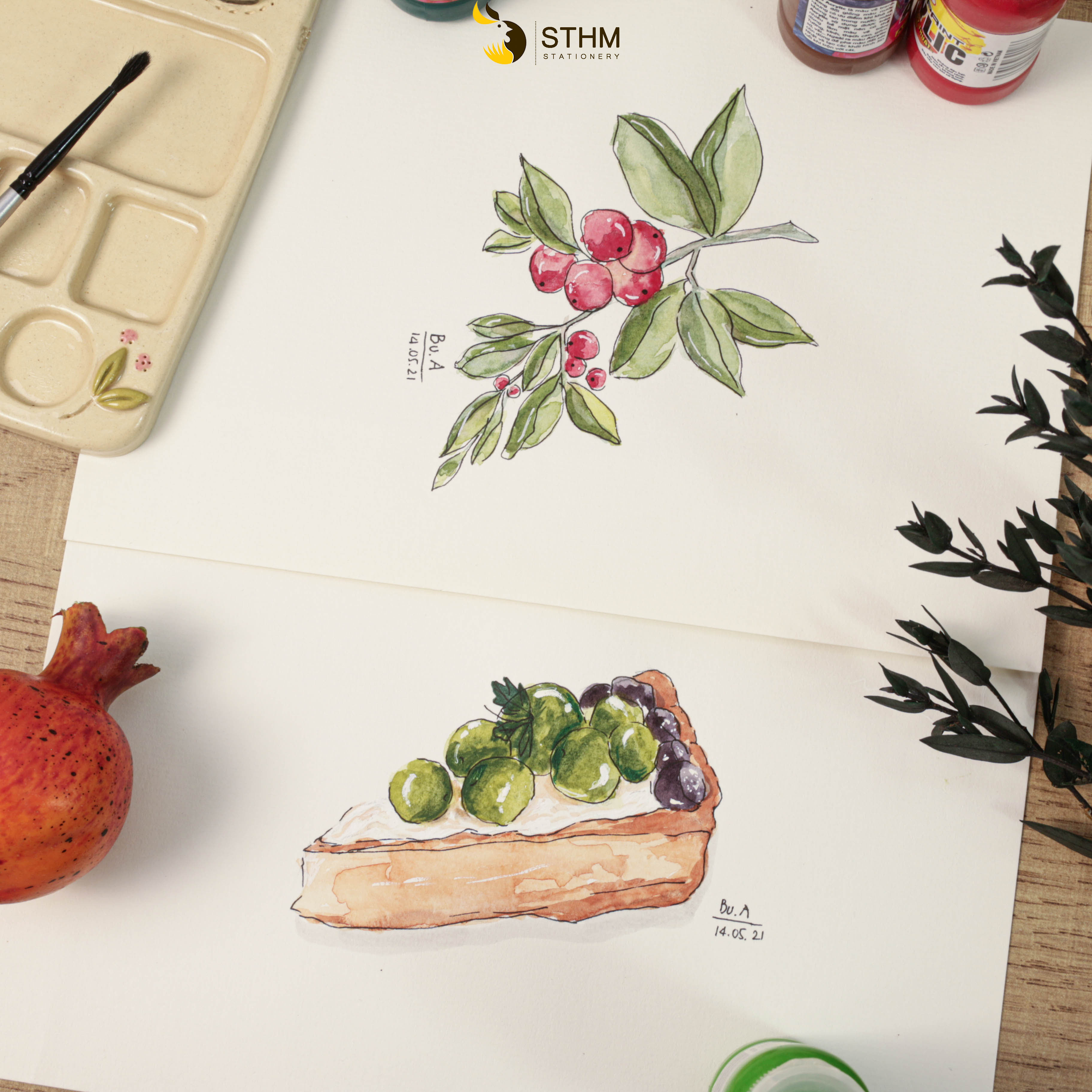 Giấy vẽ màu nước truyền thống 220gsm vân ngang thích hợp cho các bạn tập vẽ hoặc vẽ các chất màu che phủ tốt như màu Gouache, màu acrylic, sáp dầu, ....