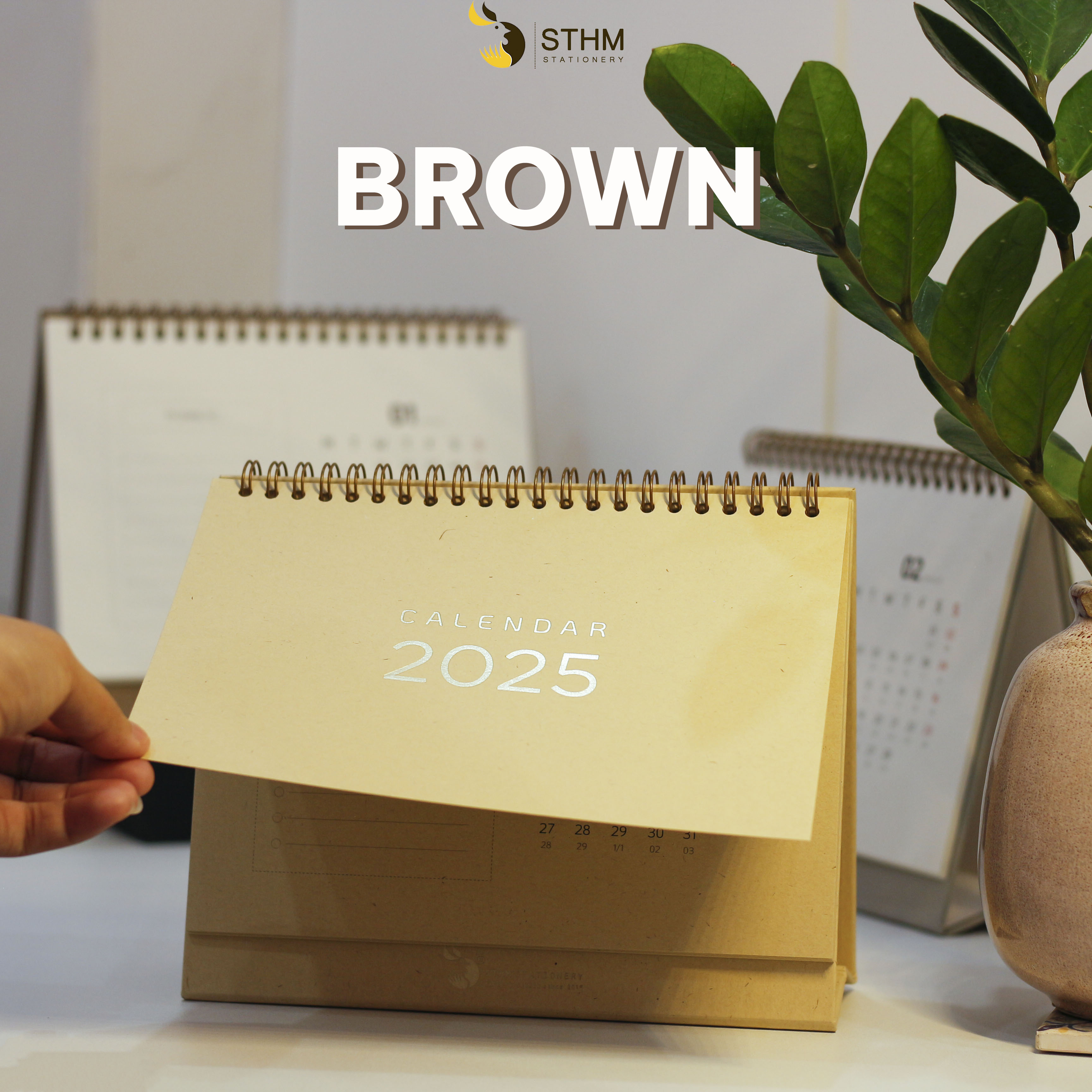 1. BROWN: Ruột lịch toàn bộ là giấy mỹ thuật màu nâu vàng 220gsm, đế lịch màu nâu vàng