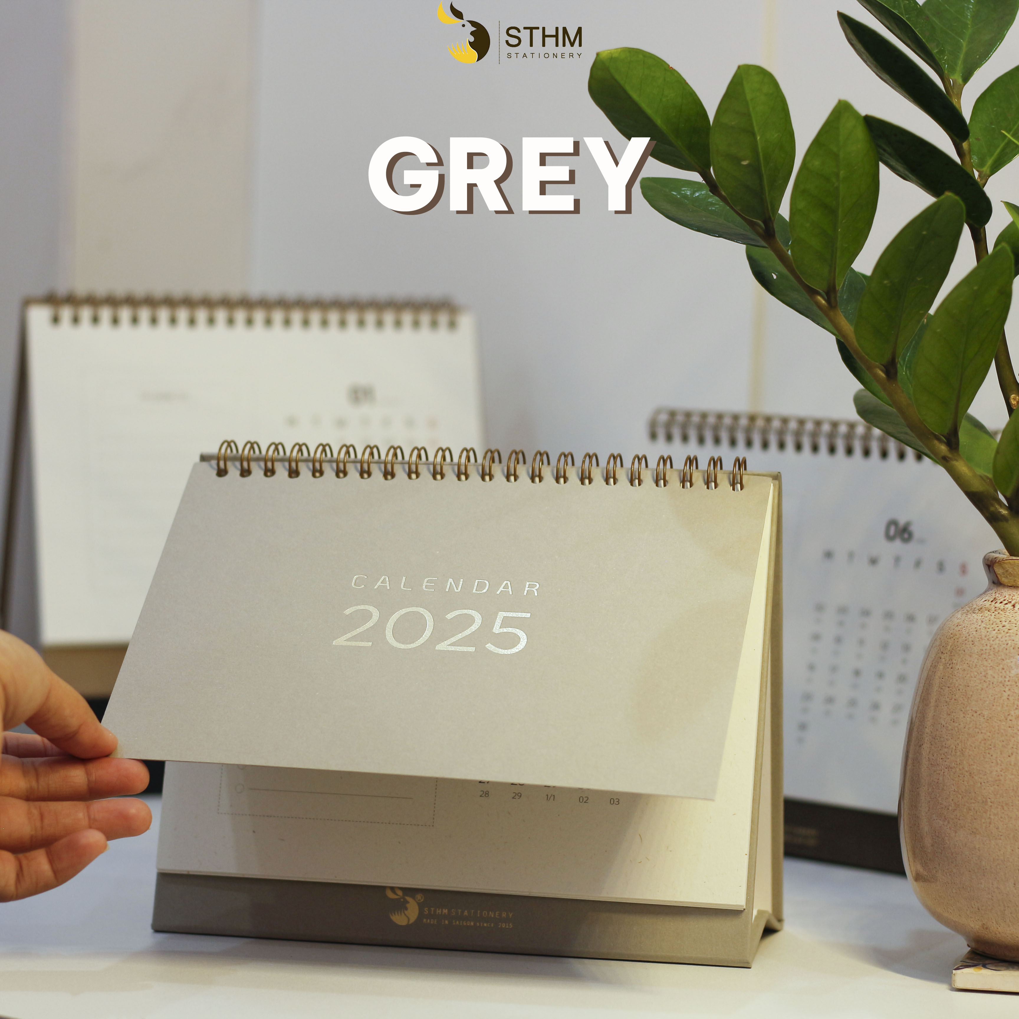 2. GREY: Tờ bìa là giấy mỹ thuật xám vân nhám 250gsm, ruột lịch 12 tháng là giấy mỹ thuật hàn quốc 220gsm, đế lịch màu xám