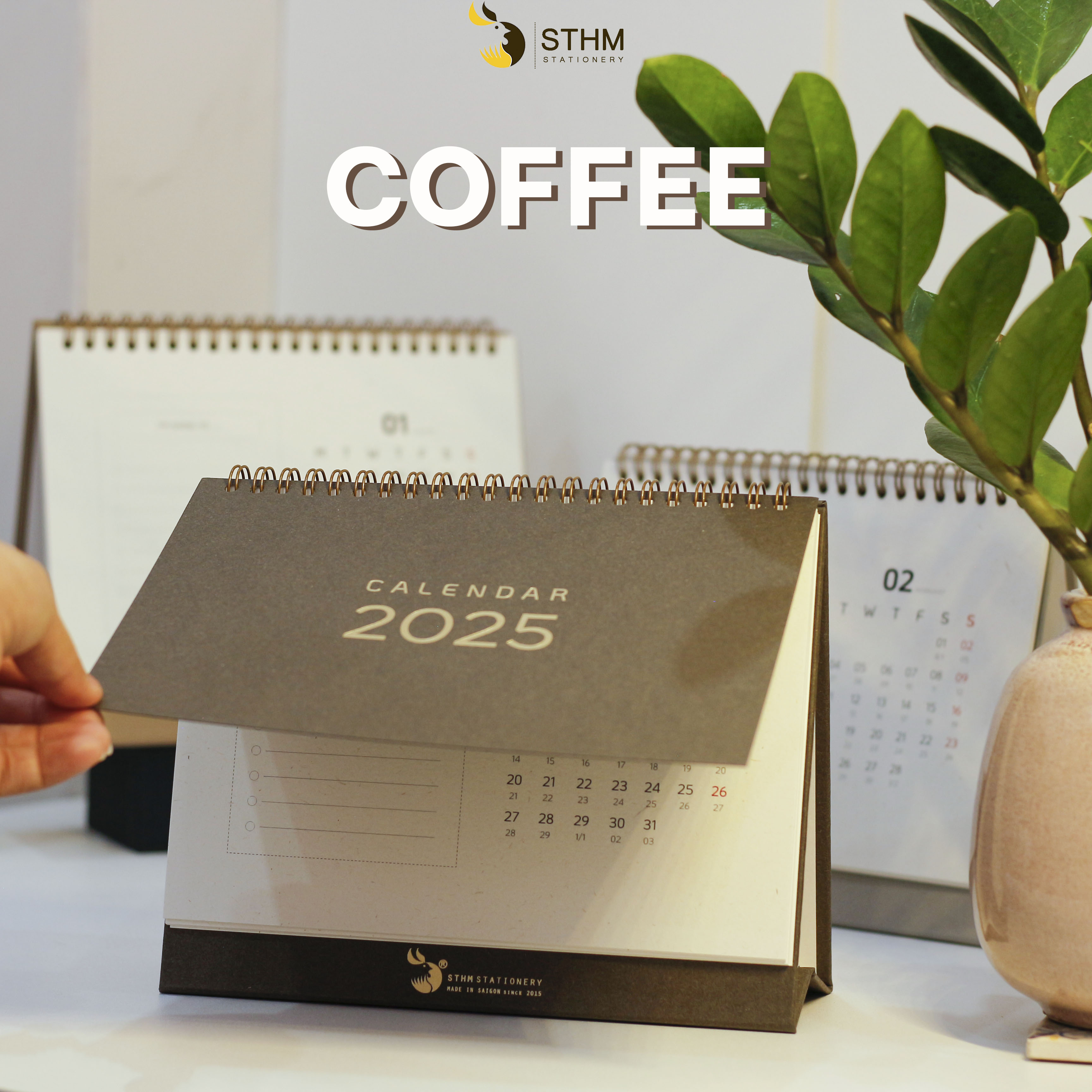 3. COFFEE: Tờ bìa là giấy mỹ thuật nâu đậm vân nhám 250gsm, ruột lịch 12 tháng là giấy mỹ thuật hàn quốc 220gsm, đế lịch màu coffee.