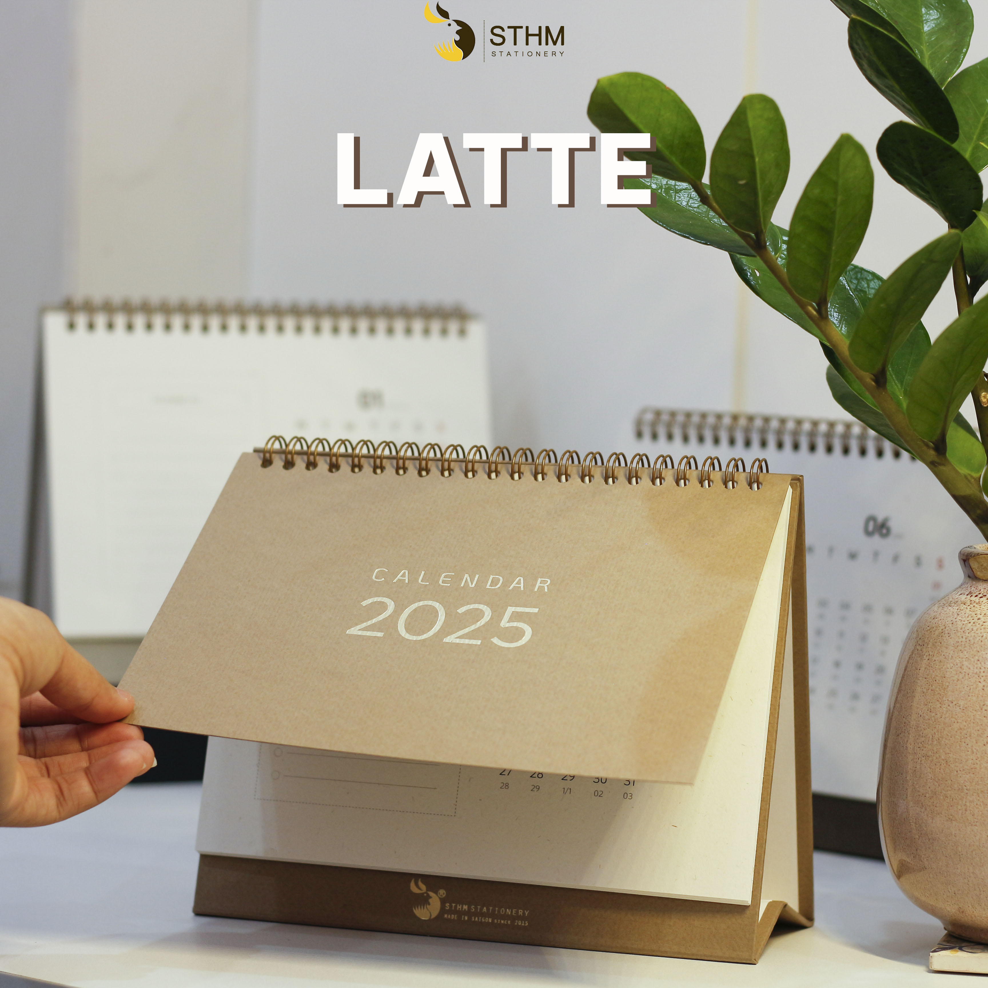 4. LATTE:: Tờ bìa là giấy mỹ thuật nâu sữa vân ngang 250gsm, ruột lịch 12 tháng là giấy mỹ thuật hàn quốc 220gsm, đế lịch màu latte.