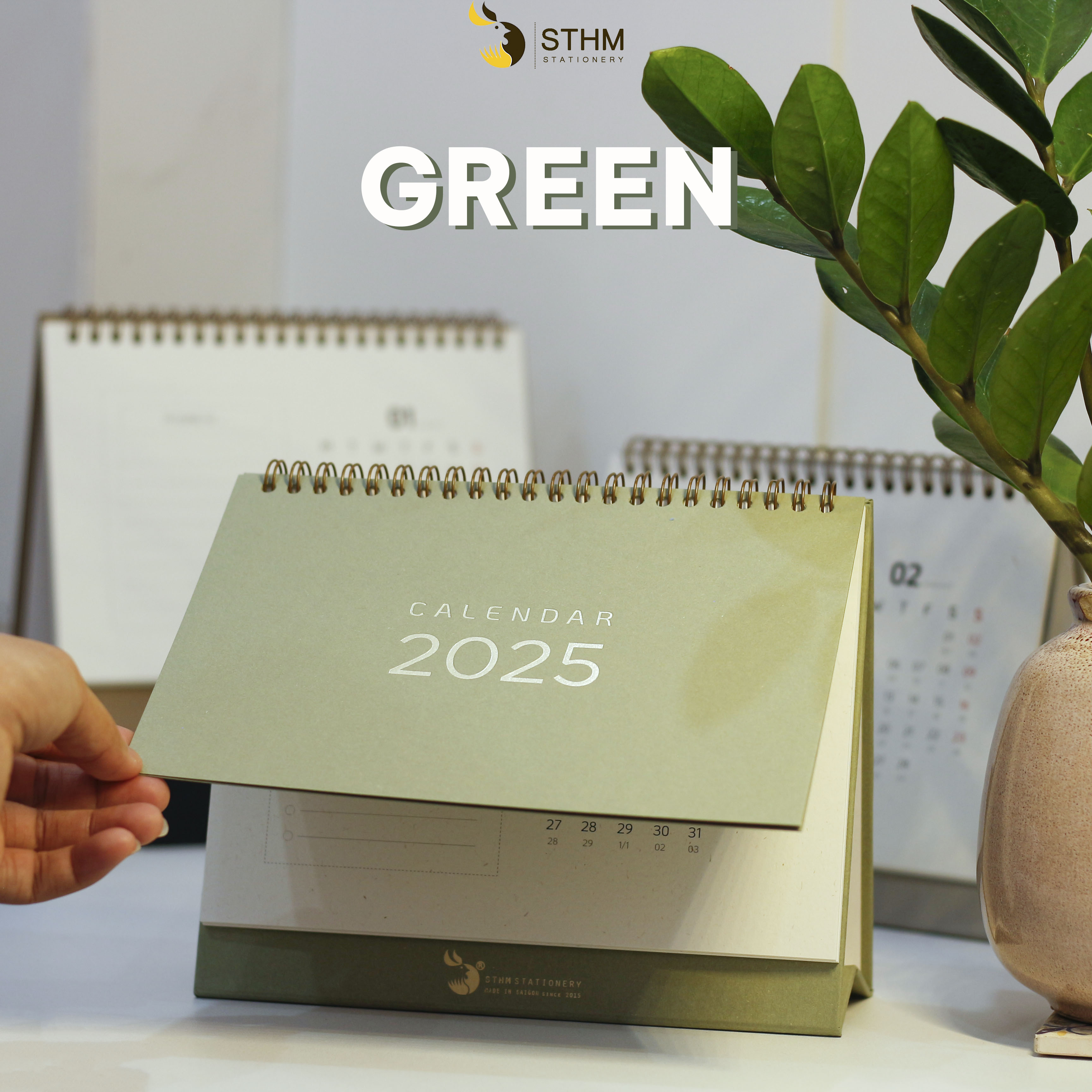 5. GREEN: Tờ bìa là giấy mỹ thuật xanh lá vân nhám 250gsm, ruột lịch 12 tháng là giấy mỹ thuật hàn quốc 220gsm, đế lịch màu xanh lá.