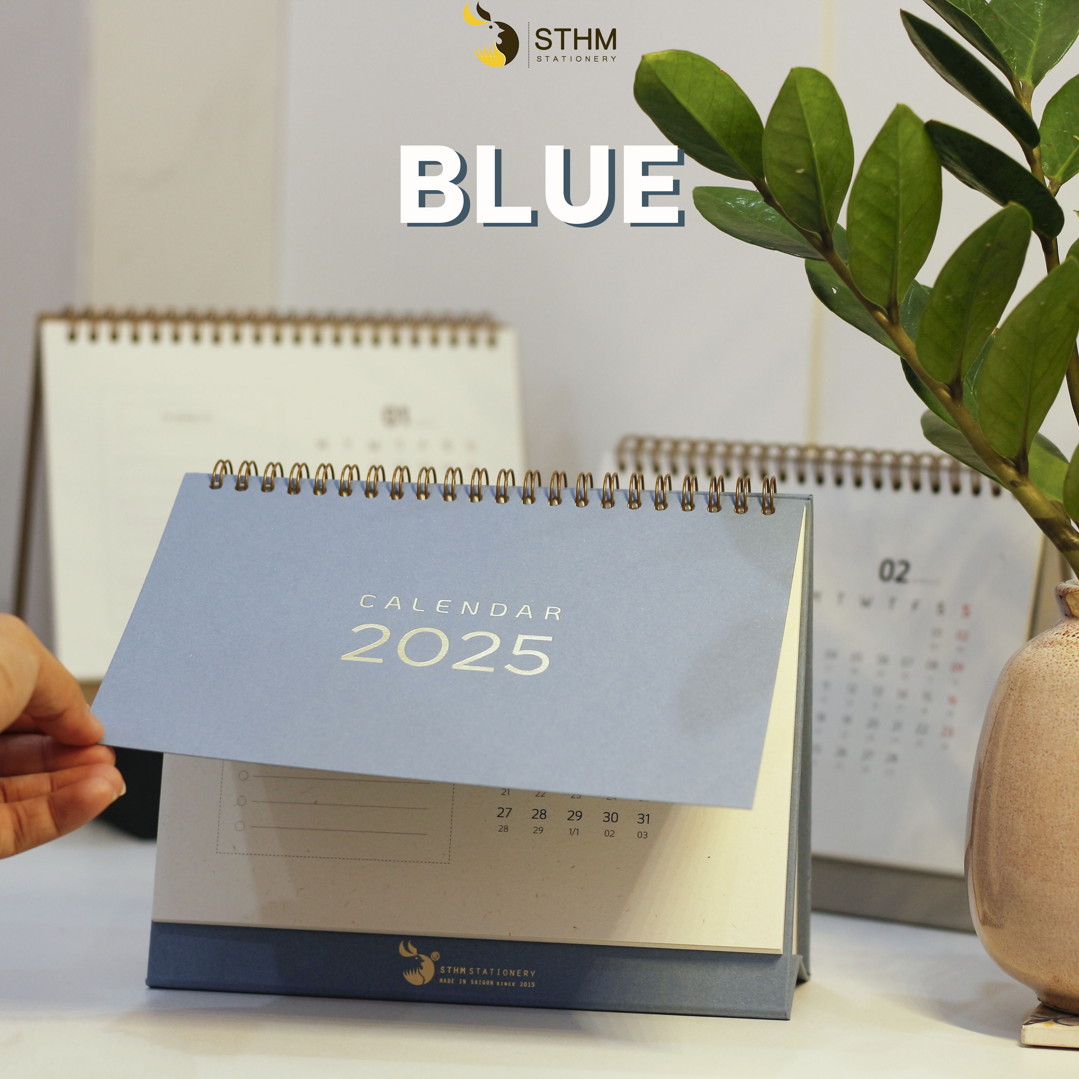 6. BLUE: Tờ bìa là giấy mỹ thuật xanh dương vân nhám 250gsm, ruột lịch 12 tháng là giấy mỹ thuật hàn quốc 220gsm, đế lịch màu xanh dương.