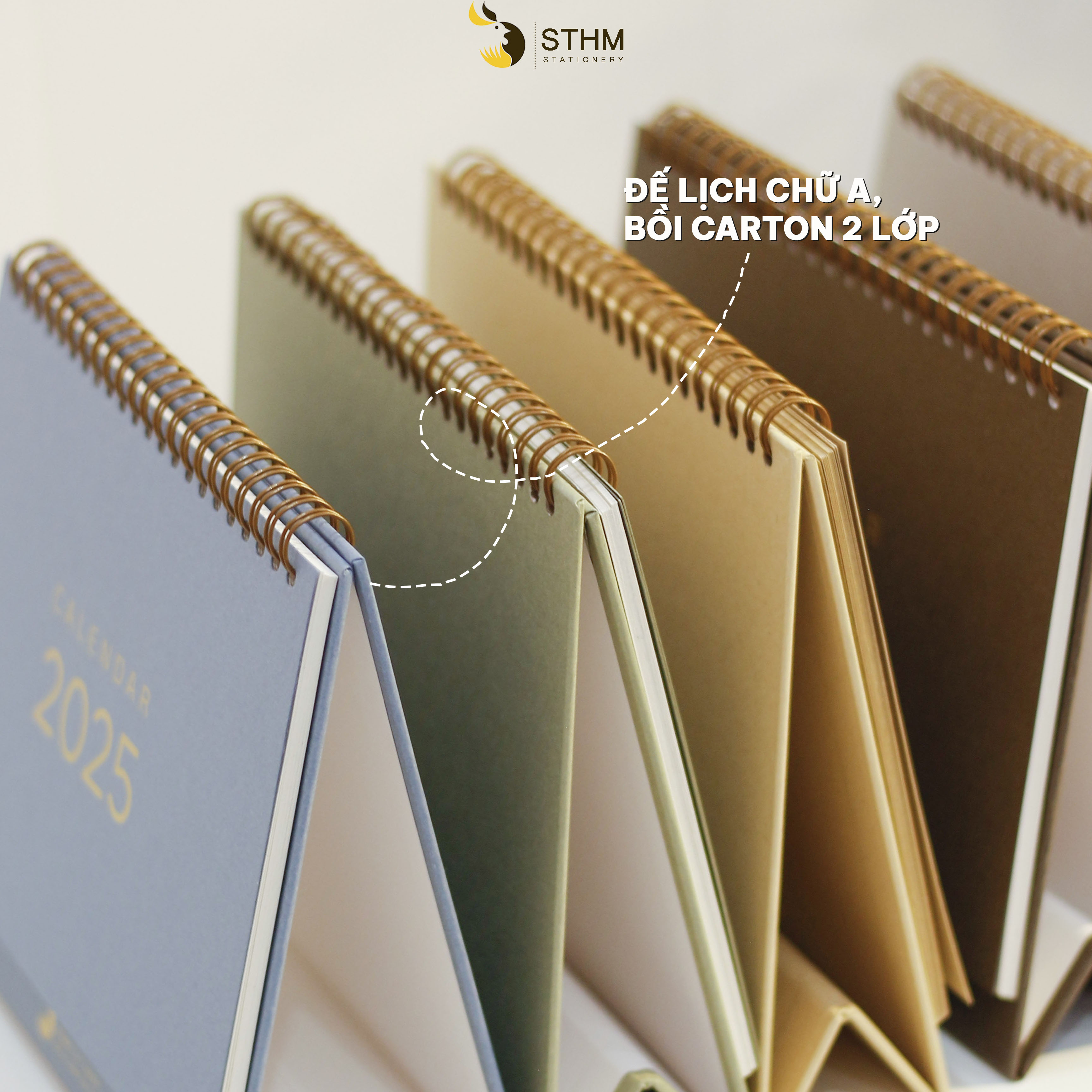8. Tờ cover mỗi bộ lịch đều cùng màu, cùng chất giấy mỹ thuật với đế lịch, chữ Calendar 2025 được ép kim vàng đồng.