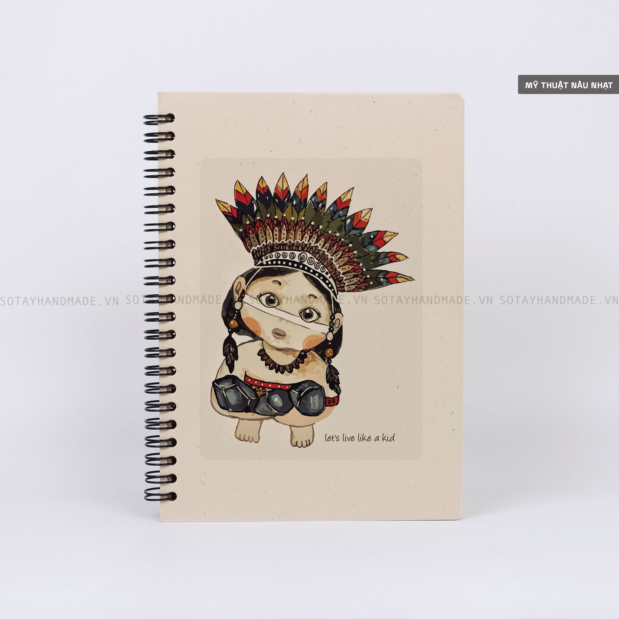 Bìa được bồi từ 2 tờ Mỹ thuật nâu nhạt / 2 tờ Mỹ thuật trắng ngà với carton 3 lớp (1200gsm), tương đối cứng và cầm chắc tay.