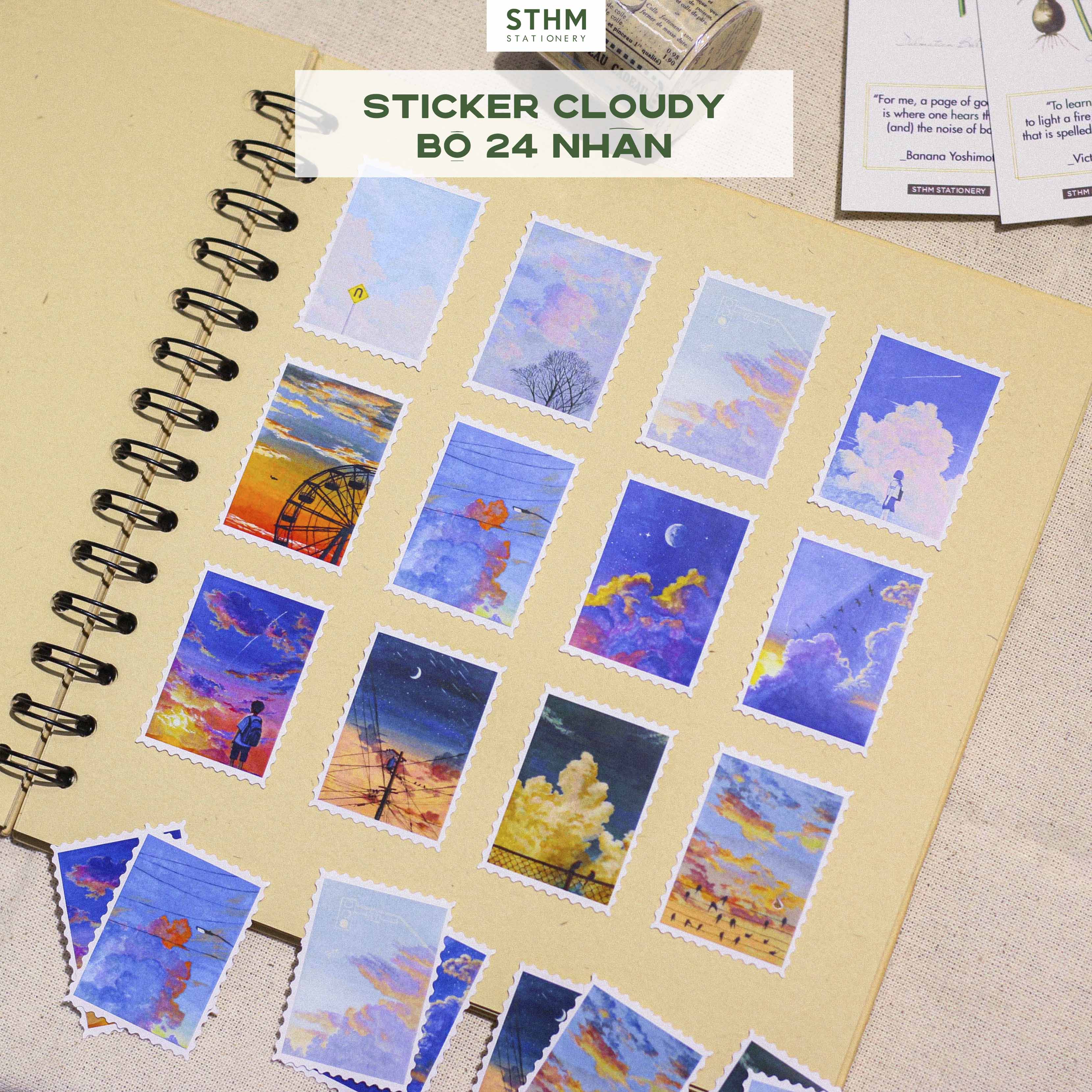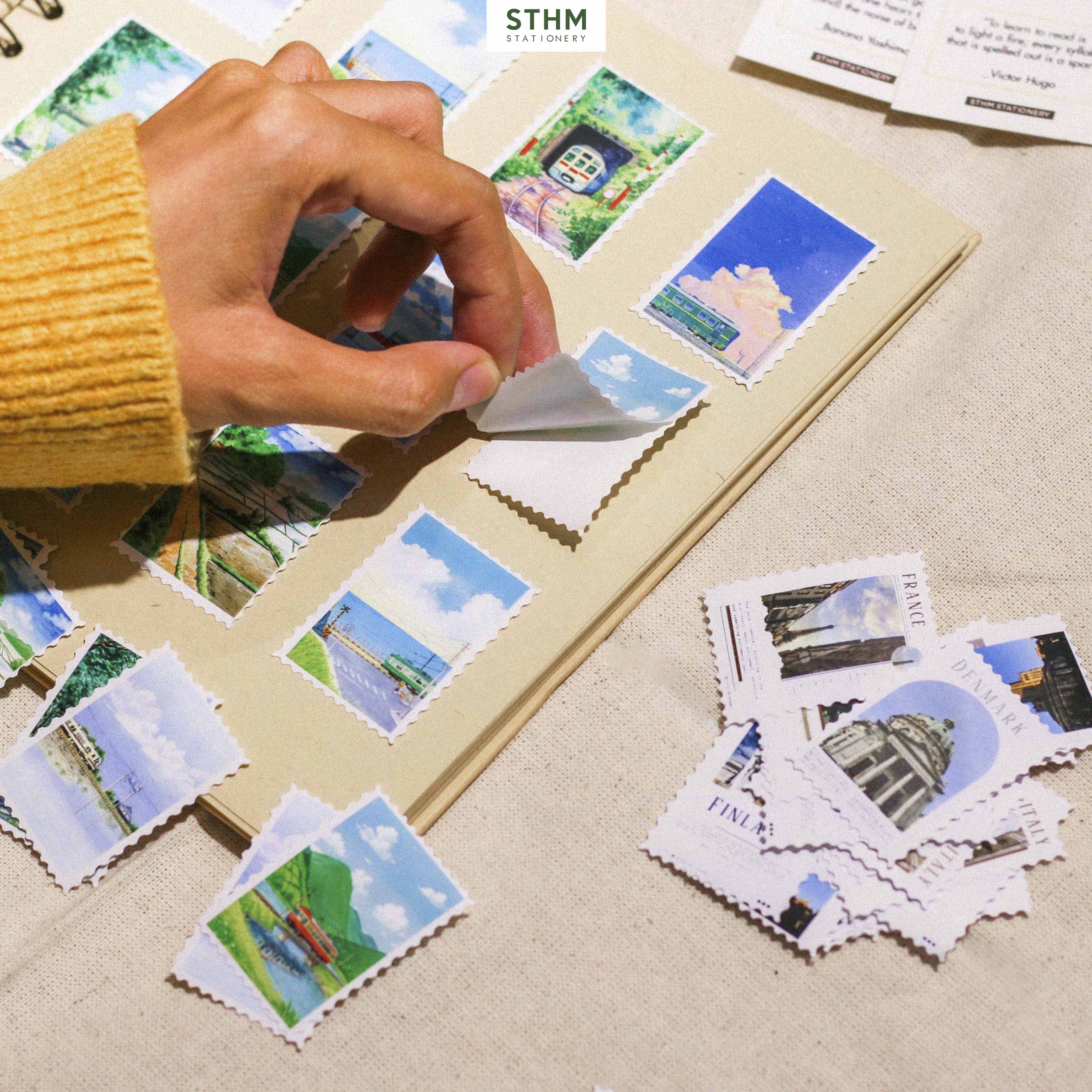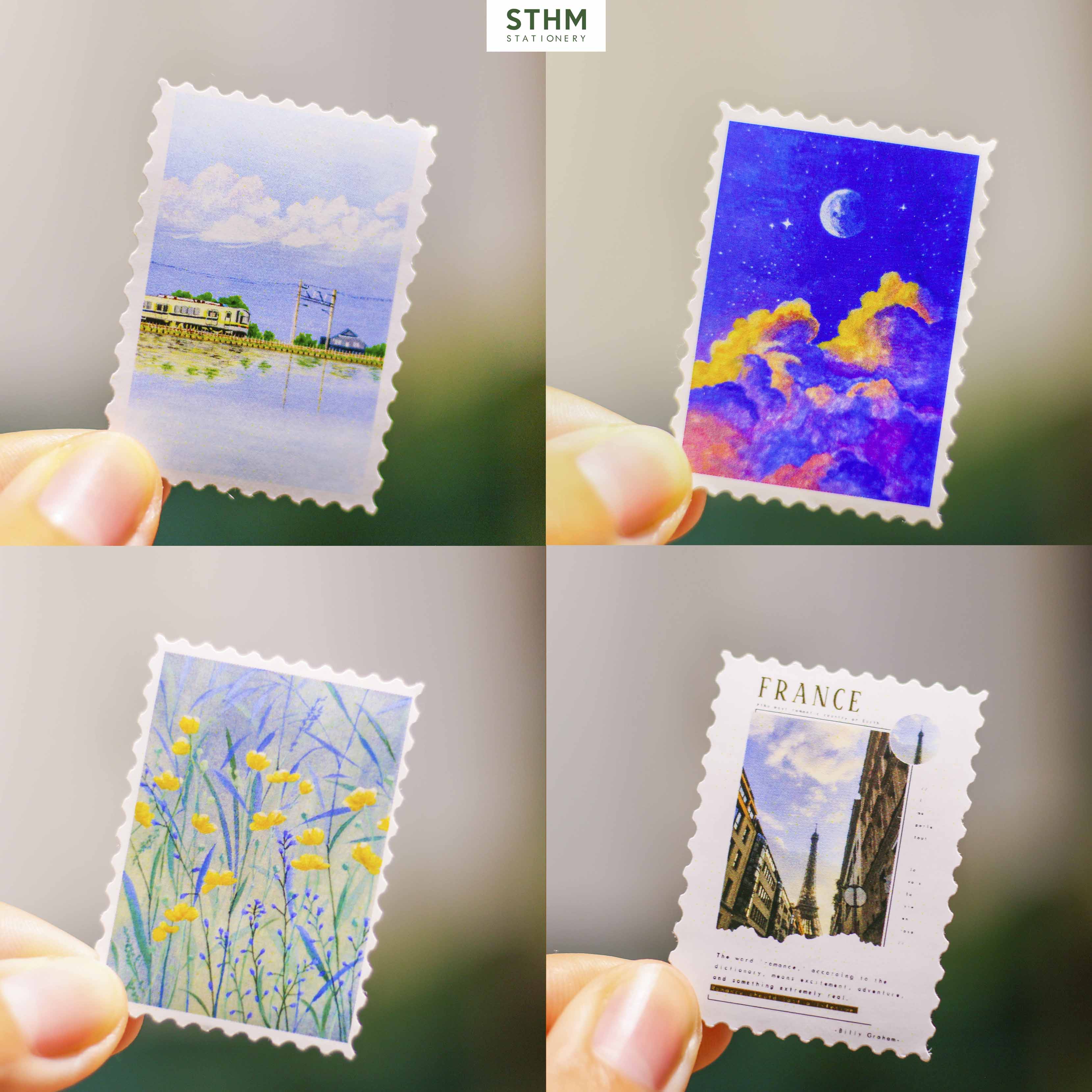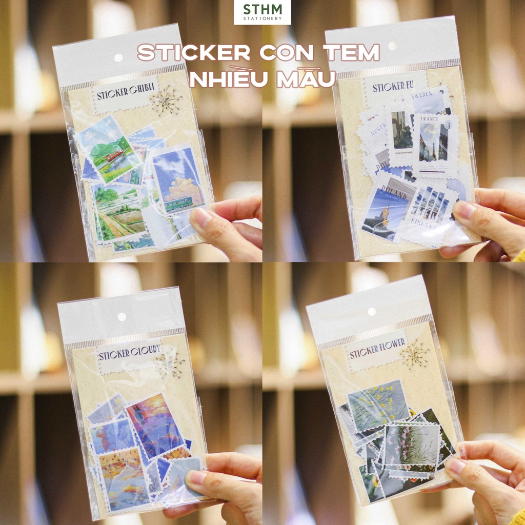 Sticker Con Tem Nhiều Mẫu do STHM Stationery tự sản xuất, hình ảnh độc quyền và được thiết kế theo form con tem răng cưa. Mỗi set gồm nhiều mẫu tranh lấy cảm hứng từ phong cảnh Ghibli, bầu trời, hoa lá và kiến trúc châu Âu… tạo cảm giác nhẹ nhàng, aesthetic rất phù hợp cho các bạn thích trang trí sổ hoặc scrapbook.
