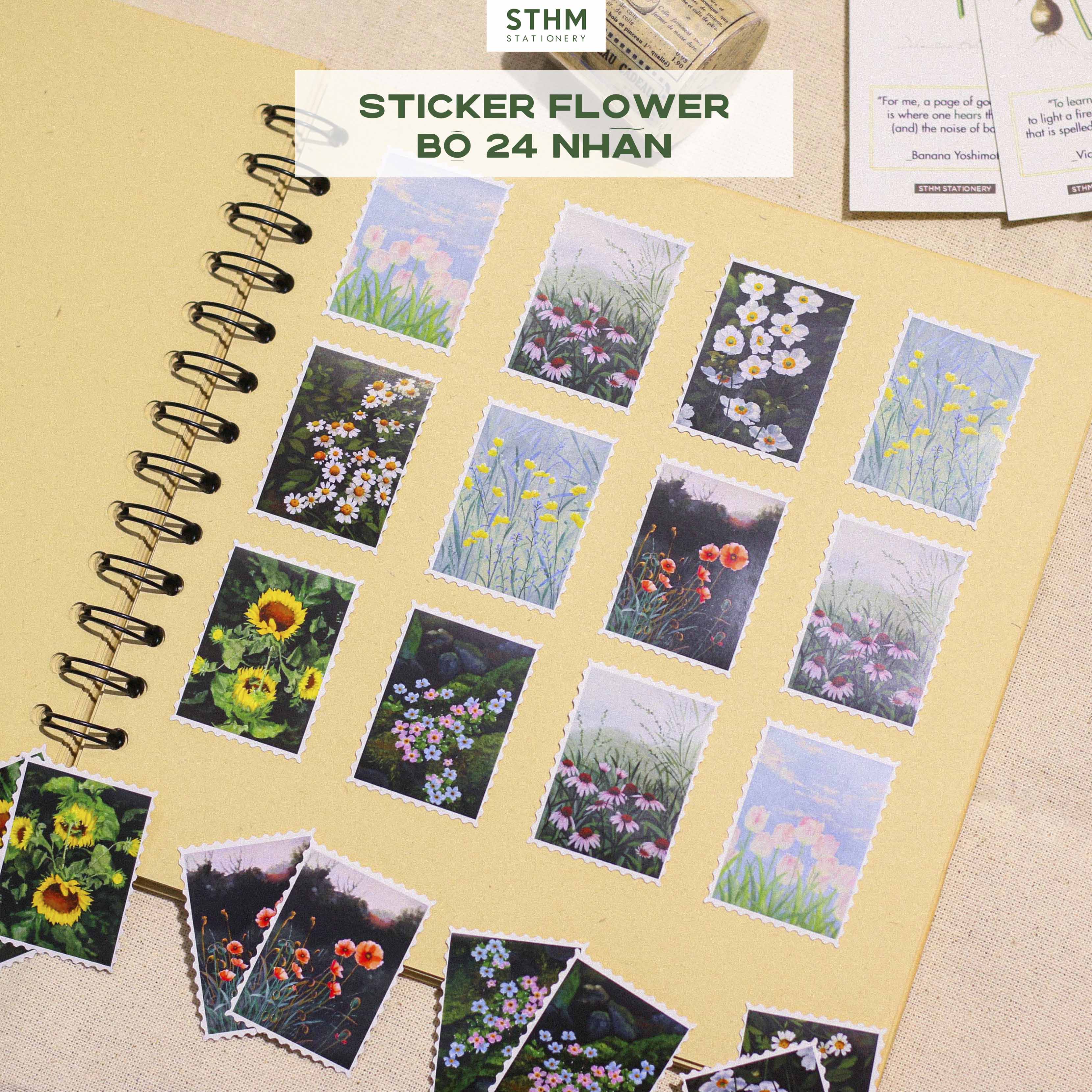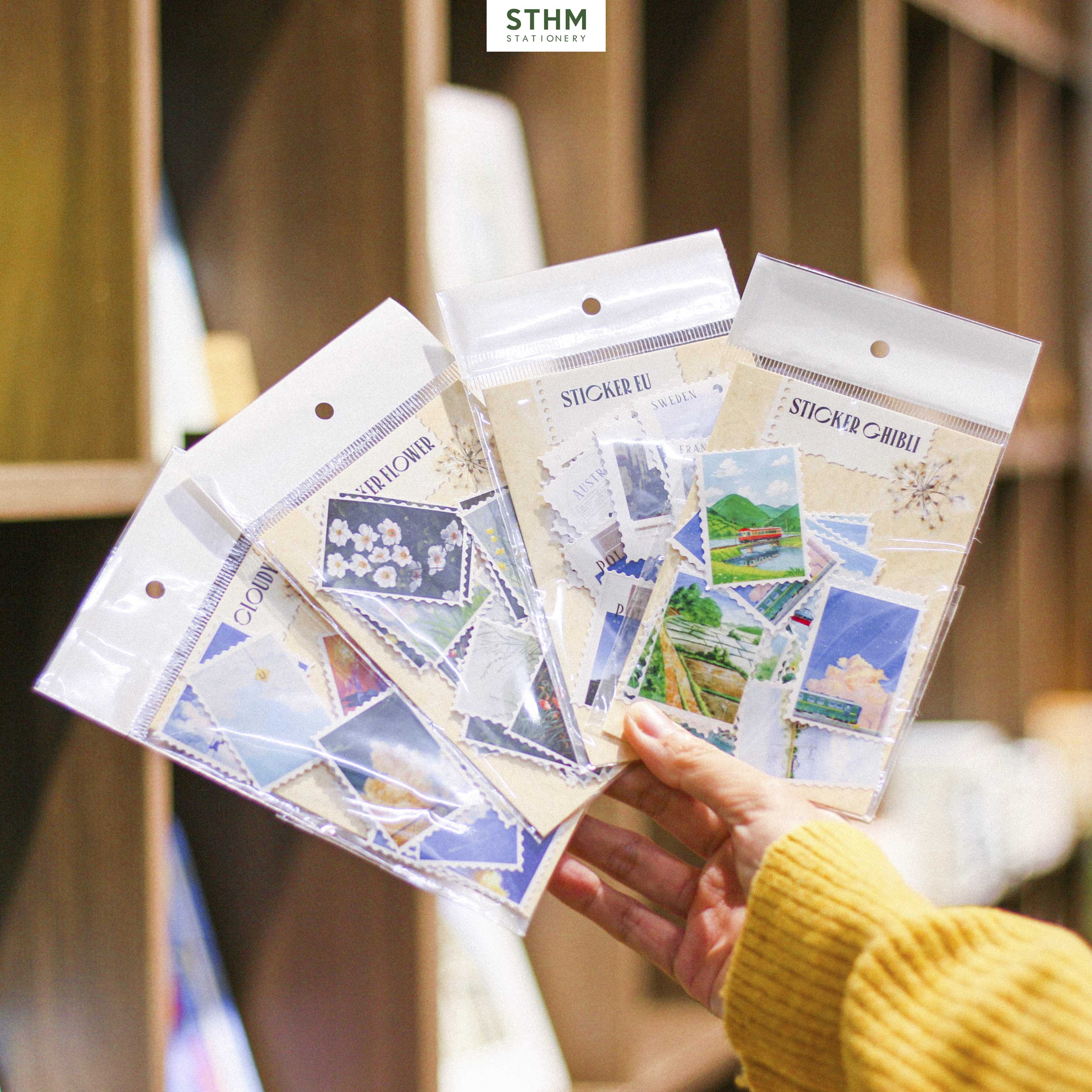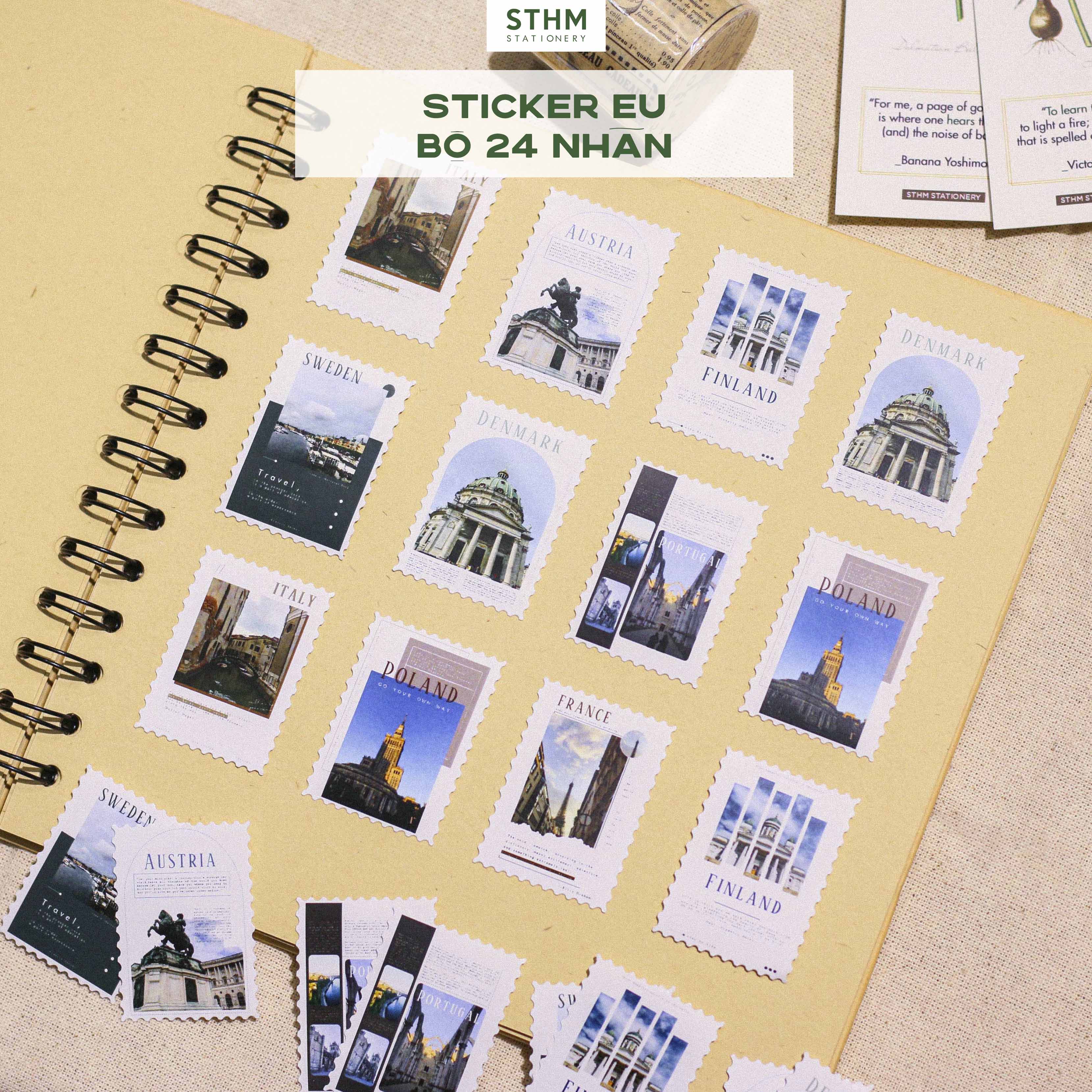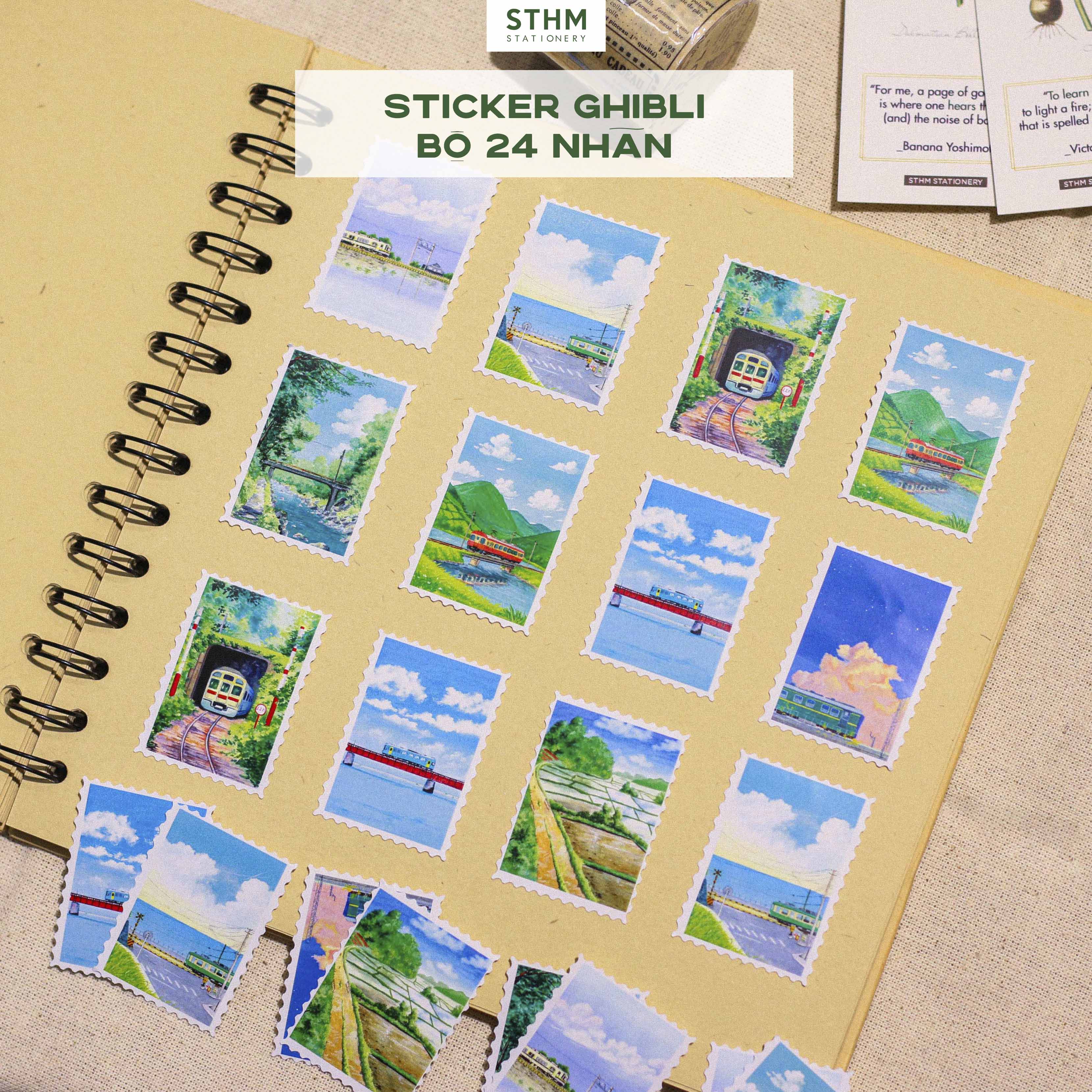 Sticker Con Tem Nhiều Mẫu do STHM Stationery tự sản xuất, hình ảnh độc quyền và được thiết kế theo form con tem răng cưa. Mỗi set gồm nhiều mẫu tranh lấy cảm hứng từ phong cảnh Ghibli, bầu trời, hoa lá và kiến trúc châu Âu… tạo cảm giác nhẹ nhàng, aesthetic rất phù hợp cho các bạn thích trang trí sổ hoặc scrapbook.