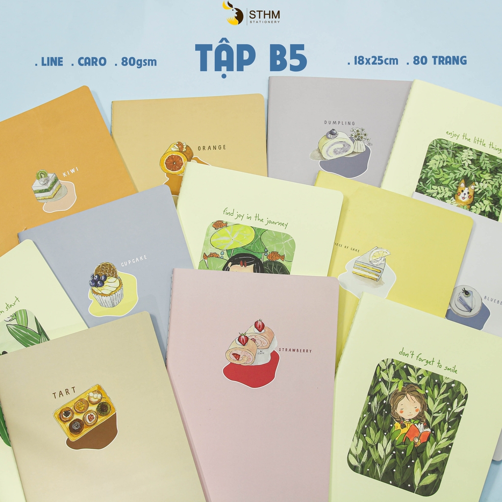STHM giới thiệu 12 mẫu Vở/tập học sinh B5 với 2 loại ruột phổ biến là Kẻ ngang và Caro. Ruột vở được làm từ chất giấy kem 80gsm chống loá mắt, không bị lem và thấm sau khi sử dụng với bút gel và bút brush nước. Tuy nhiên, giá cả lại vừa túi tiền của học sinh, sinh viên. Đường in của vở có màu xám nhạt, tạo vẻ thanh lịch và tôn nét chữ viết và ghi chú của bạn. Gáy của tập còn được may chỉ đường giữa, giúp các trang của vở được giữ chắc chắn và trải đều, dễ lật mở, đem lại trải nghiệm ghi chép hoàn hảo hơn.