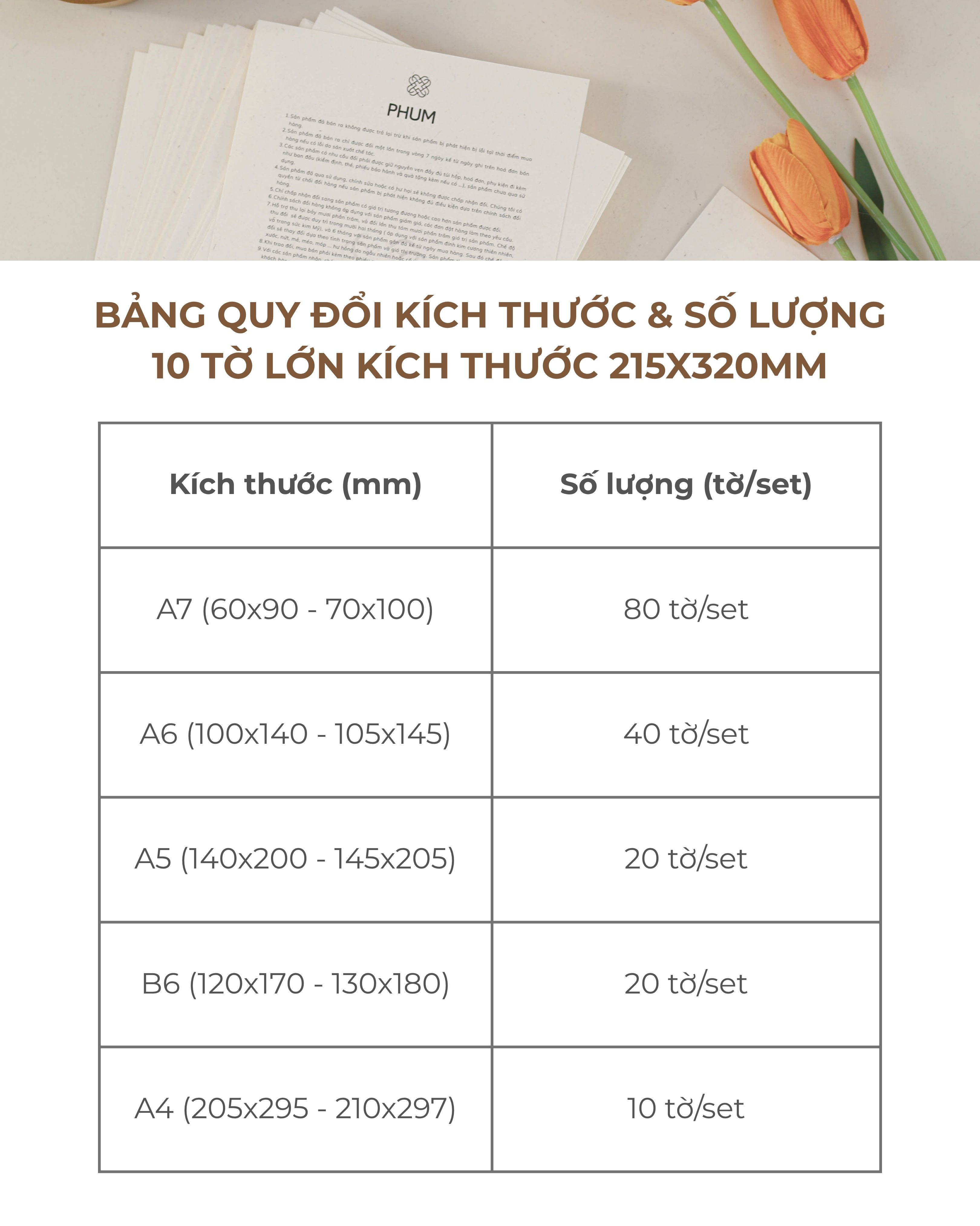 + 10 tờ kích thước 215x320mm --> in được khoảng 38-40 tờ A6 (100x140; 105x145; 80x120; 90x130mm)